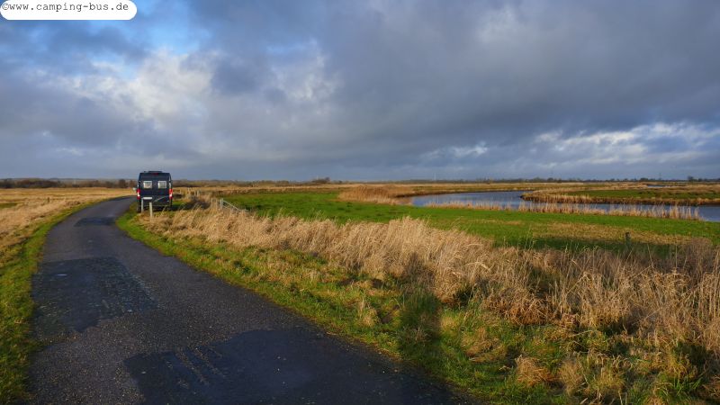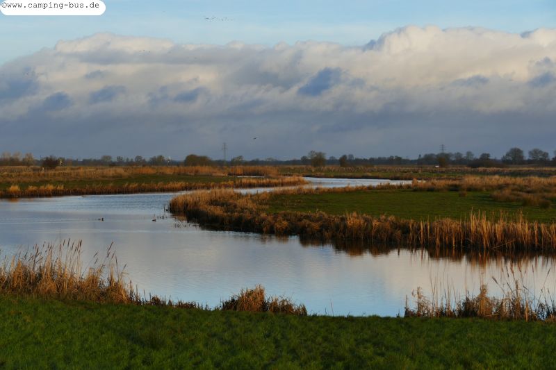 31.12.2025 / 01.01.2026 Husum - Treene 35 km Die erste Etappe unserer Überwinterungsreise endet schon nach ca. dreißig Minuten an der Treene im Südosten Nordfrieslands. Nein, wir haben keine Panne! Menschen und vor allem Hund wollen hier einen ruhigen Jahreswechsel ohne Böller verbringen und so fahren wir auf einen Platz in der unbewohnten Wildnis :-) Die nächsten wenigen Häuser sieht man in einiger Entfernung auf der anderen Seite der Treene.