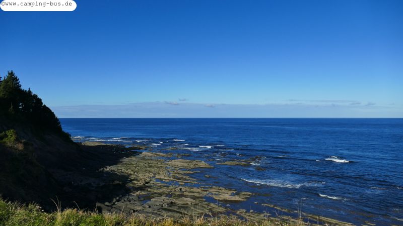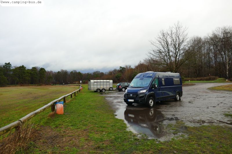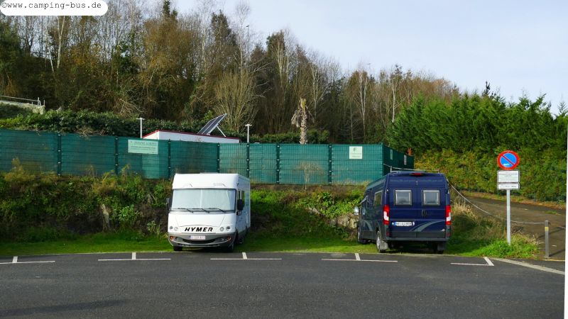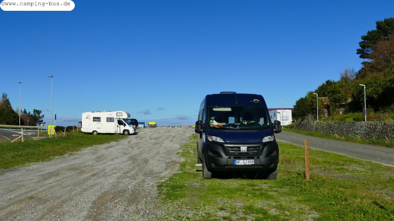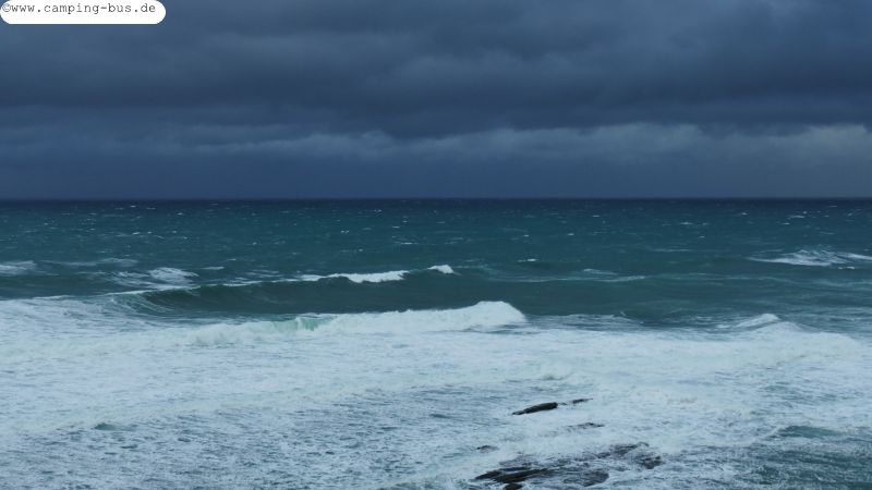 Ab Freitagmittag gibt es eine Sturmwarnung mit Böen bis 90 km/h aus Westen für die Küstenregion. Deshalb bleiben wir am Freitag hier und parken windgeschützt auf der Westseite des Platzes. Während auf dem Hügel gegenüber die Bäume kräftig im Wind schaukeln, merken wir hier absolut nichts.