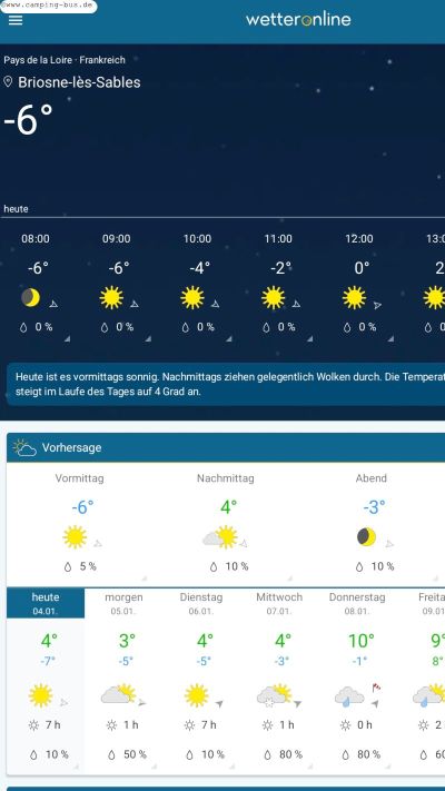 03./04.01. Zuydcote - Briosne-lès-Sables bei Le Mans 461 kmZwei Premieren auf dem Wohnmobil-Stellplatz Briosne-lès-Sables bei Le Mans! Bei überwiegend wolkenlosem Himmel und einem ca. 20minütigen Schneeschauer kurz vorm Ziel fahren wir am Samstag von der französischen Kanalküste zum Stellplatz in Briosne-lès-Sables bei Le Mans.