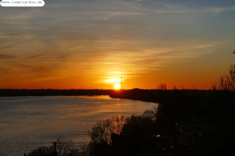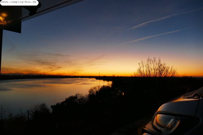 Bei solch einer Aussicht aus dem Wohnzimmer kann man doch mal selbst zum Kuschelcamper werden! Dank Hecksitzgruppe haben wir trotz der engen Parkplatzsituation freie Sicht über den Fluss auf die untergehende Sonne und den Abendhimmel - ist das nicht traumhaft schön und jedes Kuschelcamping wert?