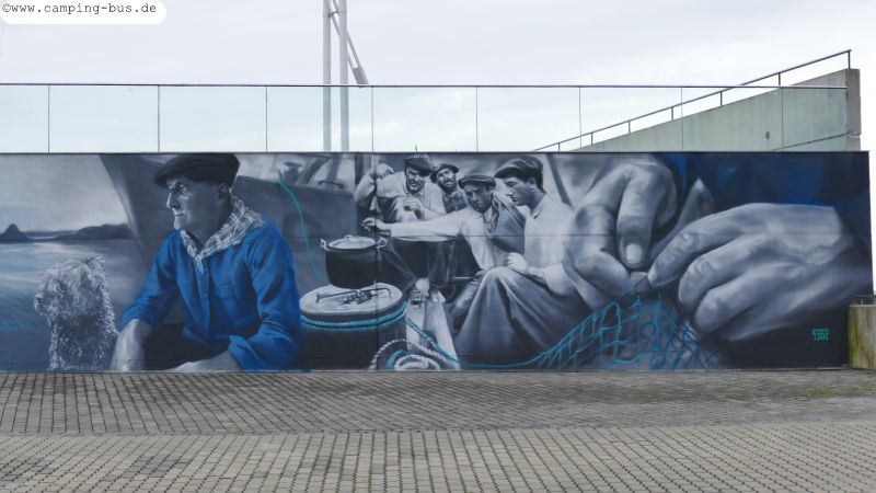 Wir fotografieren einige Wandgemälde (Murals), von denen es im Ort noch weitere gibt. Das trübe und kühle Wetter lockt uns aber nicht zu einer größeren Ortsbesichtigung.