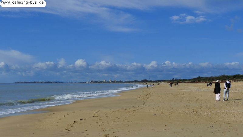 Einen ruhigen Parkplatz mit Blick auf Strand und Meer finden wir Samstag in Islantilla. Bei frischer Meeresluft und 16 Grad im Schatten machen wir einen Spaziergang am Strand nach Osten und gehen dann auf dem Boulevard an leeren Hotels und Appartementanlagen zurück.