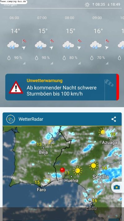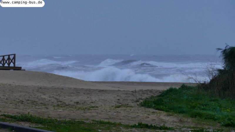 Als der Wind nachlässt gehe ich nochmal an den Strand, danach beschließen wir spontan, jetzt die Costa de la Luz zu verlassen. Für die nächsten Tage werden nur noch Böen bis 60 km/h angekündigt. Die vorerst höchsten Wellen haben wir also gesehen. Das Hauptziel unserer Reise ist ja Galicien! Also machen wir uns auf den Weg nach Norden. Mal sehen, wann wir dort ankommen.