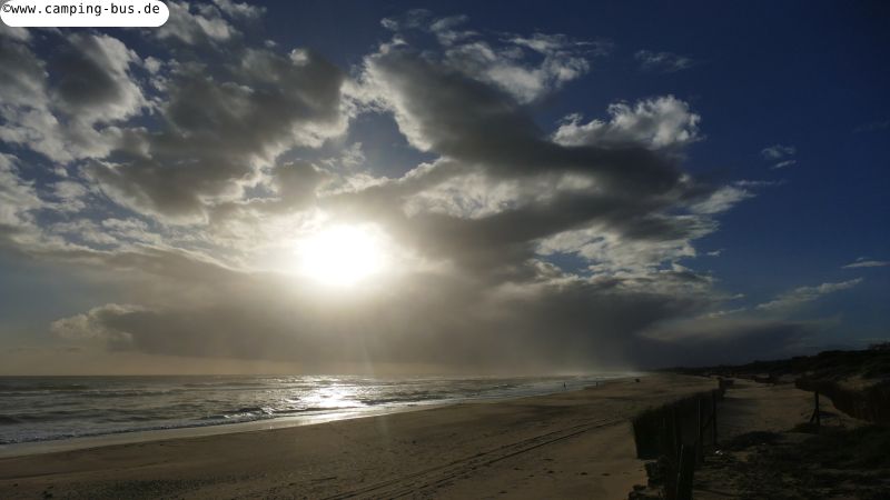 25. bis 28.01. La Palma del Condado - Islantilla 84 kmSeit Beginn unserer Reise haben wir ja unglaublich Glück mit dem Wetter gehabt. Aus allen Regionen der iberischen Halbinsel erreichen uns seit Ende Dezember Meldungen über Regen und Sturm während wir ganz überwiegend von der Sonne verwöhnt werden. Das wird sich nun aber nach den Wetterprognosen auch bei uns für die nächsten Tage ändern. Wir versuchen, windgeschützte Plätze mit festem Untergrund zu finden und fahren Sonntag wieder auf den Strandparkplatz Islantilla, auf dem wir bereits vor einer Woche waren. Dramatische Wolken über dem glänzenden Meer empfangen uns hier.