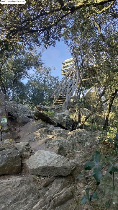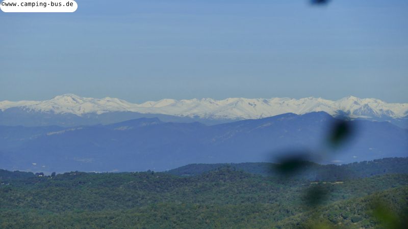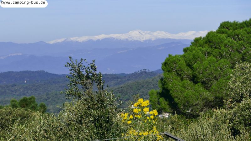 Eigentlich wollten wir von hier am Montag nur eine kurze Wanderung zum Aussichtsturm "Mirador de las Mirandes" machen. Aber da haben wir ja erstmal "Die Riesen des Waldes" besucht. Zum Aussichtsturm machen wir uns am Dienstagmorgen auf den Weg. Zwischen Korkeichen, Steineichen und Häusern gibt es ab und zu Lücken mit freiem Blick auf die Pyrenäen.