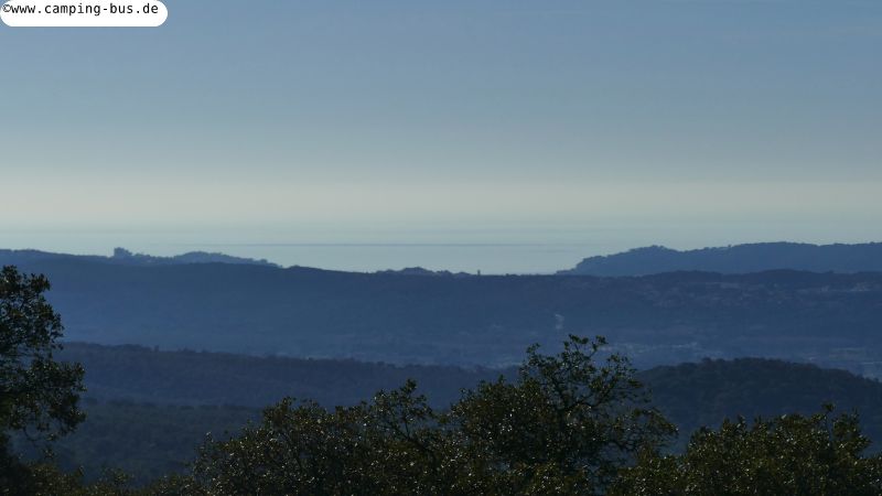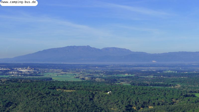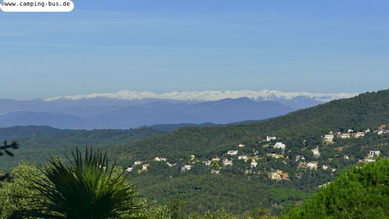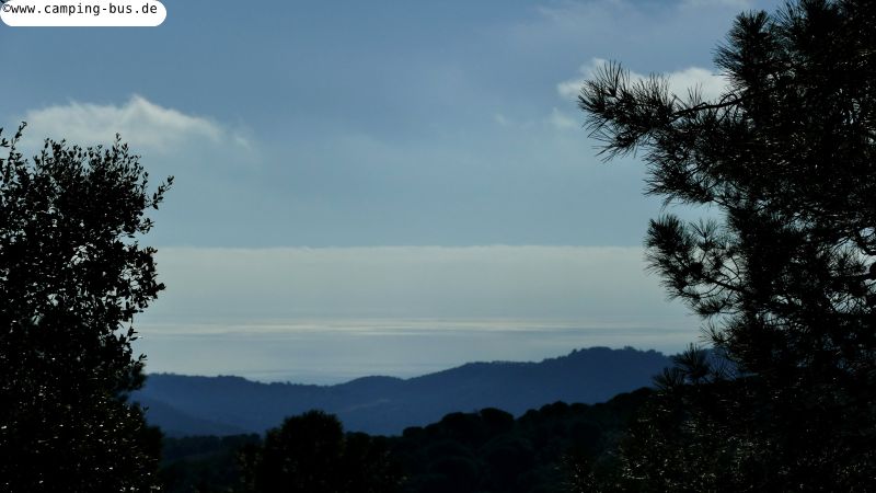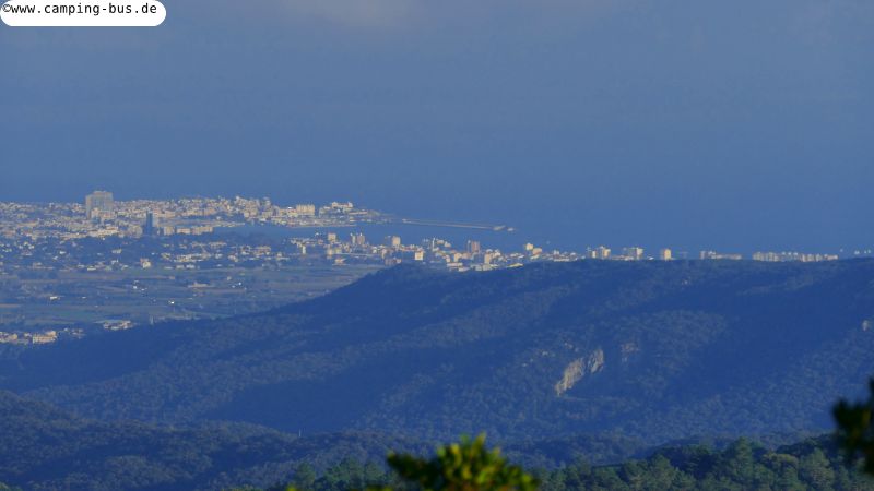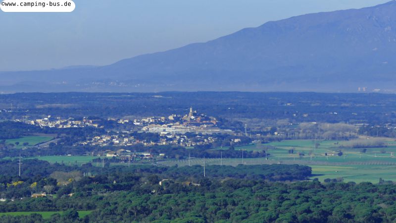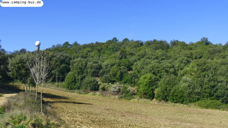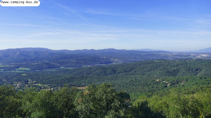 Vom Aussichtsturm, den ich vergessen habe zu fotografieren, blickt man von den Pyrenäen im Nordwesten über Mittelgebirge und die Stadt Llagostera im Westen bis zum Mittelmeer im Süden. Das ist unter einem dünnen Grauschleier allerdings kaum zu erkennen.