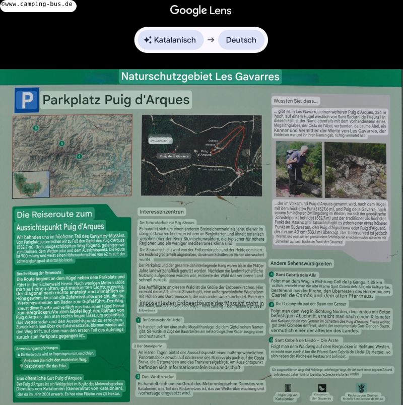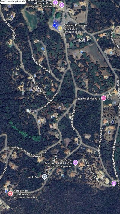 Nach der Rückkehr bleiben wir auf unserem Platz im Grünen - wo sollte es schöner sein als hier und heute? 25. bis 27.02. Romanyà de la Selva - Puig d`Arques 6 kmNach zwei Tagen in Romanyà de la Selva fahren wir 5.600 Meter weiter zum Parkplatz Puig d`Arques.