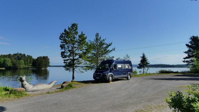 Mit dem Wohnmobil durch Schweden von der Ostseeküste bis zum Polarkreis - die Nächte werden täglich länger und hellerTeil 1 von 18: Mit dem Wohnmobil durch Lappland 16.06. bis 07.09. 2016 Wir fahren mit dem Wohnmobil durch Dänemark nach Südschweden. Ab Malmö geht es zunächst an der Küste nordwärts und dann ab Halmstad auf der 26 landeinwärts. Wir übernachten an Vänern-See, Siljan-See und Storsjön. Richtig dunkel wird es nicht mehr, die Zeit zwischen Sonnenuntergang und Sonnenaufgang wird von Nacht zu Nacht deutlich kürzer. Schweden blüht in allen denkbaren Farben und der Himmel zeigt sich fast nur in blau. Flensburg- Dänemark - Öresund -Vistorp`s Hamn - Hällekis/Vänern-See - Äppelbo/Dalarna - Siljan-See/Mora - Storsjön/Östersund - Storuman - Polarkreis - Dundret/Gällivare 18. bis 27.06.201618. - 20.06. Flensburg- Storebelt - Tystrup-See - Kopenhagen - Öresund - Malmö - Vistorp`s Hamn/ Ranarpsstrand 474 kmVon Flensburg fahren wir auf dem Landweg über Storebelt-Brücke und Öresundtunnel und -brücke staufrei durch Dänemark nach Schweden (Gebühren für unseren Campingbus unter 6 m: Storebelt 240 DKK/ 33 Euro, Öresund 390 DKK/ 53 Euro). Die Storebelt-Brücke Zwischendurch machen wir einen Abstecher zum Tystrup-See knapp 100 km südwestlich von Kopenhagen. Nachdem wir den Öresund teils unter und teils über dem Meer überquert haben fahren wir ab Malmö nordwärts zum 24-Stunden-Parkplatz Vistorp`s Hamn (Ranarpsstrand) in Südschweden. Gleich neben dem Parkplatz liegt der Strand, die Wildrosen stehen in voller Blüte. Hinter unserem Übernachtungsplatz leuchten die schönen Schwedenhäuser in der Abendsonne. Während wir frühstücken können wir uns beim Blick aufs Meer über den blauen Himmel freuen. 20./21.06. Vistorp`s Hamn/ Ranarpsstrand - Gislaved - Mullsjö-Sandhem - Utsikten Hällekis/Vänern-See 345 kmBei Halmstad verlassen wir die Küste über die "26" und fahren zum "Husvagnsparkering" am See bei Sandhem/ Mullsjö. Wir bleiben einige Zeit dort aber nachdem der erste Güterzug über die Bahnlinie direkt daneben gedonnert ist ... ... fahren wir zu dem ursprünglich geplanten Platz "Utsikten Kinnekulle" bei Hällekis am Vänernsee. Hier sind schon die dunklen Wolken angekommen. Für die Nacht wird Regen angekündigt. 22. - 23.06. Utsikten Hällekis/Vänern-See - Lissgranstrand/Äppelbo/Dalarna 282 kmVom Abendessen bis zum Frühstück gibt es am Vänern-See leichten Dauerregen, nach den Start noch einige Zeit Nieselregen. Ab Filipstad nehmen die sonnigen Abschnitte zu. Unser Ziel ist der Picknickplatz Lissgranstrand am Västerdalälven bei Äppelbo in Dalarna. Hier können wir sofort die Campingstühle rausstellen, die Wolken ziehen nach Nordosten davon. Hier blüht es in allen Formen und Farben und das Wetter ist perfekt. Da freuen sich Menschen und Hund. Es gibt ringsherum Lupinen ... ... und wilde Stiefmütterchen. Hahnenfuß (gelb) und Storchenschnabel (blau) wachsen und blühen hier bunt gemischt. Die Glockenblumen lassen sich selbst vom Schotterstreifen direkt neben der Fahrbahn nicht aufhalten bei ihrem Drang ans Licht. Von der schwachen Strömung des Västerdalälvens ist kaum etwas zu bemerken bei den Spiegelungen im Wasser. Obwohl die Sonne zwischen 22:37 und 3:34 Uhr noch 5 Stunden hinter dem Horizont verschwindet wird es hier nicht mehr richtig dunkel. Hier sehen wir den Abendhimmel kurz nach 23 Uhr, ... ... hier den Nachthimmel zur dunkelsten Zeit kurz nach 1 Uhr in Richtung Nordnordwest ... ... und Nordost. Am Mittag kommt netter Besuch zur gemeinsamen Mittagspause, Brigitte und Friedrich mit ihrem Pössl auf dem Weg zum Nordkapp. Mit ihnen kommt etwas dichtere Bewölkung die sich am späten Nachmittag wieder auflöst. Hier ein Smartphone-Video von unserem Platz in Dalarna - nicht erschrecken, das Vogelgezwitscher kommt "original" vom Video: 23./24.06. Lissgranstrand/Äppelbo/Dalarna - Sollerön/Siljan-See - Sunne/Strosjön/Östersund 413 kmVon Äppelbo fahren wir zumächst zum 24-Stunden-Parkplatz für PKW, Wohnmobile und Wohnwagengespanne am Siljan-See südlich von Mora. Unser Ziel für die Übernachtung ist aber der kleine Parkplatz am Storsjön bei der alten Kirche von Sunne. Ganz friedlich liegt das See-Ungeheuer des Storsjön (Info-Tafel dazu am Parkplatz) vor unserem Campingbus. Ebenfalls friedlich dreht vor uns Familie Gans ihre Runden auf dem See. Der Innenraum der Kirchenruine wird offensichtlich ab und zu für Veranstaltungen genutzt. Wenn man die richtige Position erwischt sieht man durch ein Fenster der Ruine den Turm der neuen Kirche, ... .. die etwas entfernt im Grünen neben den Häusern des kleinen Dorfes liegt. Den Sonnenuntergang um 23:16 Uhr habe ich verschlafen aber ab 2:20 Uhr bin ich wach und warte auf den Sonnenaufgang. Offizielle Aufgangszeit ist um 2:52 Uhr, ich muss bis ca. 3:15 Uhr warten bevor sie über den Erhebungen der Insel Frösön sichtbar wird. Da ich die Bilder aus dem Bett gemacht habe steht der Baum im Weg, er wollte einfach nicht zur Seite gehen. :-) 24./25.06. Sunne/Strosjön/Östersund - Utsikten Storuman 308 km Die folgende Nacht verbringen wir auf dem Parkplatz am Aussichtsturm von Storuman. Bei der Ankunft ist das Wetter noch schön aber dann kommen dunkle Wolken und ein kurzes Gewitter. Die für lange Zeit letzte Nacht dieser Reise verschlafen wir bei bewölktem Himmel. 25 - 27.06. Utsikten Storuman - Piteälven - Polarkreis - Dundret/Gällivare 403 km Zur Mittagspause an den Stromschnellen des Piteälven ist der Himmel wieder blau. Der Fluss in seiner ganzen Breite lässt sich von der Brücke nicht fotografieren, deshalb hier ein Video: Gestern haben wir Lappland erreicht, heute überqueren wir den Polarkreis auf der E 45. Die Bäume werden kleiner und statt üppigem Blütenmeer an den Straßenrändern gibt es nur noch gelegentlich blühende Flecken. Bei ca. 20 Grad ist die Luft frisch und klar, die Fernsicht phantastisch. Vom Parkplatz am Vajkjaure nördlich von Jokkmokk sind die schneebedeckt
