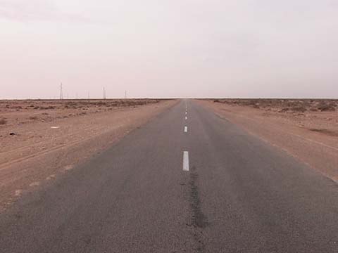 Die nächsten 100 km zwischen Tarfaya und Laayoune sehen genauso aus. Dieses Foto könnte an jedem beliebigen Punkt der Strecke entstanden sein, außer wenn die Strasse mal einen Bogen macht. Die sind sicher hin und wieder absichtlich eingebaut worden, damit die LKW-Fahrer, die hier ständig pendeln müssen, nicht einschlafen. Falls Sie über eine Suchmaschine oder einen externen Link direkt auf diese Seite gekommen sind: Hier gibt es den vollständigen Reisebericht "Marokko im Wohnmobil 2003/2004". Hier geht es direkt zur nächsten Fotoseite.