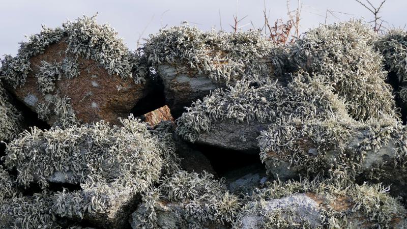 Die Steine an der Mauer sind dicht mit Flechten bewachsen.