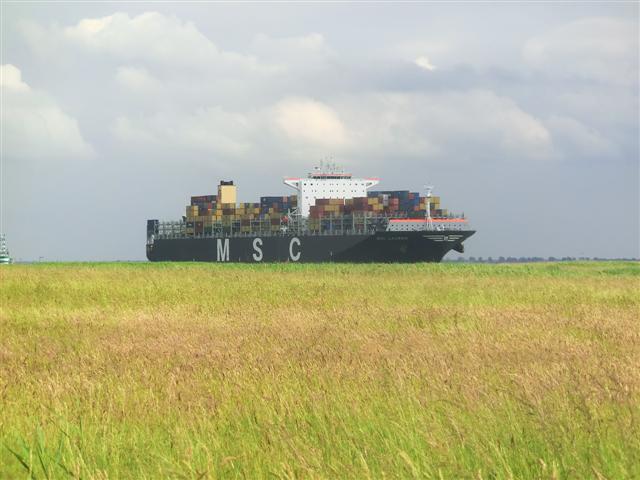 Wenn man aus Richtung Antwerpen in der Ferne ein Schiff kommen sieht wie hier die MSC Lauren ... ... dauert es über 30 Minuten, bis es die Nähe des Wohnmobil-Stellplatzes erreicht.
