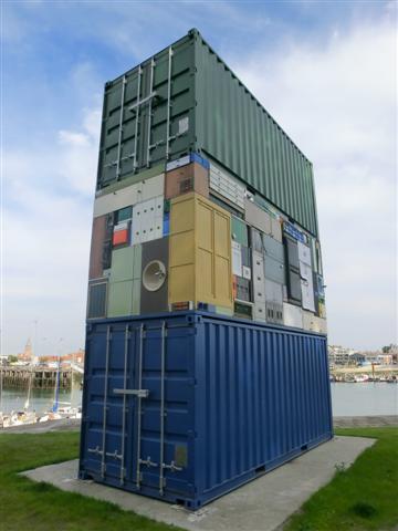 Mit der 363 m langen und 45,60 m breiten hochbeladenen CMA CGM Cassiopeia davor erscheint der Kran nun wiederum weniger gewaltig. Mehr Bilder vom Containerhafen Zeebrugge, den Marine Days und aus Zeebrugge-Bad vom Strand gibt es hier im 9. und letzten Teil unseres Reiseberichtes. Zwischen Container- und Yachthafen entdecken wir diese "Containerskulptur" - ... was alles in so einen Container passt! Ein WALD im Hafen? Ja, einer kleiner Wald trennt den Marinehafen mit dem Wohnmobilstellplatz ...