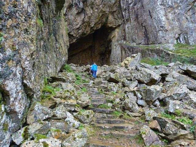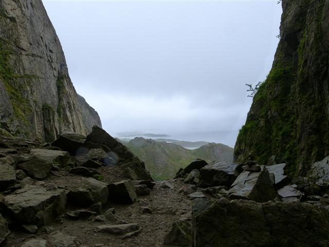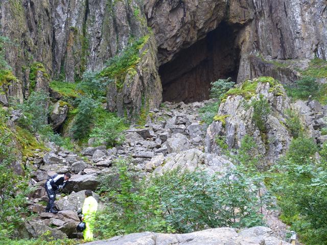 So ist denn unser vitaminreiches Mittagessen gesichert - es müssen nicht immer die allgegenwärtigen Blaubeeren sein. Sehr sanft steigen die Felsen neben dem Weg an - mal was anderes als die oft anzutreffenden Steillhänge. So kann man bequem den Hügel erklimmen und wird auch durch die kärgliche Vegetation nicht behindert. 07./08.08. Austra - Brønnøysund - Torghatten 133 km, Fähre Holm - Vennesund 20 Min./116 KronenDer 14. Tag unserer Reise beginnt in der Nacht mit leichtem Regen - bei einer Norwegenreise hätte es uns schlimmer treffen können. Im Laufe des Tages regnet es zwar kaum noch aber die dunklen Wolken bleiben uns erhalten - der erste Reisetag ohne Sonne. Einige Kilometer vor dem Fähranleger Holm erreichen wir wieder "die 17", die wir bei Namsos verlassen hatten. Die Umwege über Jøa und Austra haben sich auf jeden Fall gelohnt. Die Strecke auf der 17 von Vennesund bis Brønnøysund bietet landschaftlich nichts Reizvolles. Wir fahren durch flaches Gelände mit Wiesen und Feldern und das trübe Wetter bessert den Ausblick auch nicht. Ziel des Tages ist heute der Torghatten - der Berg mit dem Loch. Um ihn zu erreichen fahren wir durch Brønnøysund und über diese kunstvoll geschwungene Brücke. Im Hintergrund sieht man schon den ca. 12 km von Brønnøysund entfernten Berg. Hier der markante Torghatten von der Brücke aus gesehen. Laut "Fachliteratur" ist das Loch im Berg vom Parkplatz aus in 20 bis 30 Minuten "auf teilweise befestigtem Weg" zu erreichen, hier ein Blick zurück ca. 10 Minuten nach dem Start. Der "teilweise befestigte Weg" besteht mal aus leicht zu begehenden Stufen, ... ... mal aus lockerem und dank Regen glitschigem Geröll. Weder Motorradstiefel noch Wanderschuhe tragen beim Abstieg in diesen Bereichen zur Trittsicherheit bei. Auch wenn es nicht so aussieht - das "Loch" durch den Berg ist 160 m lang. Es ist kein von Menschenhand geschaffener Tunnel sondern eine durch Meeresbrandung in den Fels gefressene Höhle. Durch die Landhebung nach der Eiszeit wurde sie inzwischen auf 126 m über dem Meeresspiegel angehoben (laut Hurtigrouten - Zeit für das Beste). Von oben hat man einen schönen Blick über die Insel- und Schärenwelt - jedenfalls bei klarem Wetter. Auf dem Wanderparkplatz am Ausgangspunkt des Aufstiegs darf man übernachten - wenn man sich VORHER auf dem nahegelegenen Campingplatz anmeldet und 300 Kronen zahlt! Wenn man sich nicht meldet werden laut Info-Tafel 200% Aufschlag erhoben! Es wird generell die Nutzung des "günstigeren" Campingplatzes empfohlen. Wir nutzen weder das eine noch das andere sondern fahren zurück nach Brønnøysund, wo wir unsere Kronen lieber in etwas Geschmackvolleres investieren.