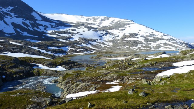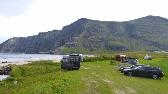 Reisebericht: Mit dem Wohnmobil durch Schweden und Südnorwegen 04.08. bis 03.09. 2015 Teil 5 von 6Westkapp - Ervik/ Stadlandet - Strynfjell/ Stryn Sommerskicenter - Lom - Sognefjell 22. bis 24.08.22./23.08. Westkapp - Ervik/ Stadlandet - Strynfjell/ Stryn Sommerskicenter 197 kmVon Meer und Strand am Westkapp umziehen in Eis und Schnee zwischen den Gletschern von Jostedalsbreen und Jotunheimen aufs Sognefjäll, vom Rauschen des Meeres zum Rauschen der Wasserfälle - in Norwegen ist das im Sommer schnell gemacht. Bei bewölktem Himmel - na sowas - verlassen wir unseren Traumplatz am Westkapp. Bevor wir ostwärts ins Gebirge fahren machen wir einen Abstecher von 3 km zum Strand von Ervik. Am Ortseingang fallen uns diese alten grasbewachsenen Steinhäuser auf. Zunächst fahren wir geradeaus in Richtung Strand, wo wir neben einer Kapelle (Foto misslungen) diesen Friedhof finden - der Begriff "See-Bestattung" bekommt hier eine ganz ungewöhnliche Bedeutung. Einige hundert Meter daneben finden wir wieder einen kleinen Campingplatz in einer etwas buckeligen Wiese ... ... direkt am Strand. Ob es beim Streichen des Zaunes an der Straße zum Strand wohl sehr windig war? Vorbei an unzähligen kleinen und großen Wasserfällen ... ... biegen wir von der Straße 15 ab auf die alte "Strynfjelletstraße". Die schmale Straße windet sich rasch aufwärts und bietet von kleinen Schotterflächen am Rand schöne Ausblicke ins Tal und auf die Berge im Westen - von dort sind wir gekommen. Nach der Ankunft am Ziel, dem Stryn Sommerskisenter - jetzt außer Betrieb - , ... ... zeigt sich bald wieder die Sonne auf dem Parkplatz am Rand der abends und nachts unbefahrenen Straße. Nach einer ruhigen Nacht zeigt sich heute wieder wolkenloser Himmel so wie fast immer seit Beginn dieser Reise vor drei Wochen. Ob diese Schnee- und Eisreste noch schmelzen bevor es Nachschub gibt? 23./24.08. Strynfjell/ Stryn Sommerskicenter - Lom - Sognefjell 133 kmNach einem Blick zurück nach Westen ... ... und auf die rauschenden Wasserfälle neben der Fahrbahn ... ... fahren wir durch die Eiswelt bei milden Temperaturen nach Osten in Richtung Grotli. Toilettenhaus mit Wasserspülung? Auf den letzten Kilometern vor der Einmündung der alten Fjällstraße auf die 15 wird aus der Teerstraße eine gut befahrbare Schotterpiste. Dann geht es abwärts in die Holzhausstadt Lom. Die Stabkirche in Lom ist eine besondere Touristenattraktion, einige Reisebusse kommen hierher während unseres Aufenthalts. Ebenfalls sehenswert sind die alte Holzbrücke über den Fluss ... ... sowie die Holzhäuser. Alle Geschäfte, Wohnhäuser ... ... und Hotels entsprechen diesem einheitlichen Baustil. Über die Holzbrücke gehen wir mit Blick auf die tosenden Wassermassen zurück zum Wohnmobil. Von Lom geht es hoch hinauf auf der höchsten Passstraße Norwegens aufs Sognefjell zwischen Jostedalsbreen und Jotunheimen. Auf einem Rastplatz auf 1.388 m Höhe verbringen wir eine ruhige Nacht. Trotz Höhenlage und Schnee um uns herum sinkt die Nachttemperatur nicht unter 5°C. Am Rastplatz gibt es dieses Kunstwerk auf einer Seite der Straße, ... ... auf der anderen Gedenksteine an Menschen die hier erfroren sind sowie an den Bau der Pass-Straße. Hier sieht man die Markierungen des alten Weges über das Sognefjäll. Gegenüber des Rastplatzes führt eine Piste bergauf - die nur teilweise schneefrei ist. Hier befinden wir uns zur Freude von Bella auf dem schneebedeckten Teil des Weges. Vom Schnee und Eis befreit sind die Seeen hier auf über 1.400 m Höhe jetzt Ende August noch nicht ... ... und das ewige (?) Eis der Gletscher leuchtet in der Sonne. Leuchten tut es auch an den Südhängen am Wegesrand - gelbe Blüten und frisches Grün erinnern eher an den Frühlingsanfang als an das nahe Ende des Sommers. Der Blick von oben auf den See vermittelt dann wieder ein Gefühl von Winter. Aufgund des klaren Himmels ... ... haben wir uns auf eine frostige Nacht eingestellt aber die Außentemperatur sinkt nicht unter + 5 Grad und ab ca. 6 Uhr am Morgen scheint schon wieder die Sonne auf unseren Campingbus - die Heizung wird nicht gebraucht. Hier geht es weiter mit unserem Reisebericht Hier geht es zur Gesamtübersicht unseres Reiseberichtes "Schweden-Norwegen 2015".