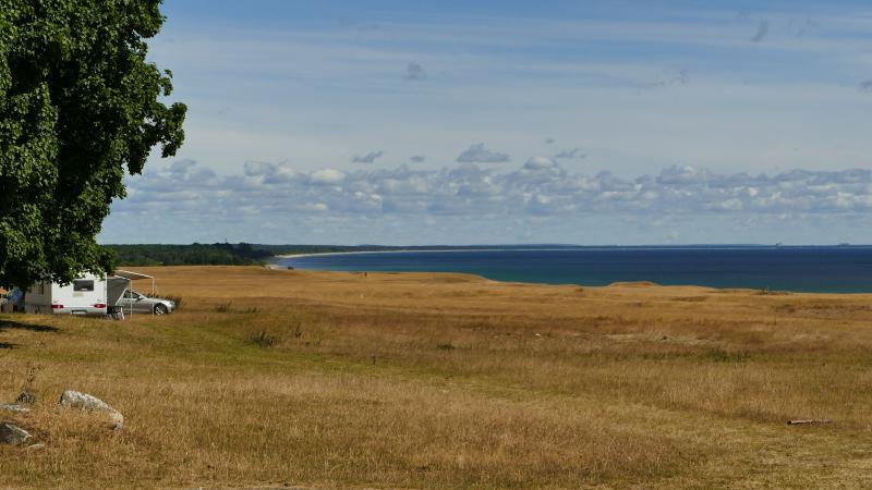 Wie wär´s mit kostenlosem Camping auf einem Truppenübungsplatz? In der Nähe des Weinguts kein Problem! Vom 22. Juni bis 19. August kann der Schießplatz Ravlunda dafür genutzt werden. Wir dachten, wir wären am Morgen des 22. die ersten auf dem Platz. Irrtum! Auf dem Bild sieht man die ca. 20 km lange Hanöbucht mit ihrem Sandstrand.