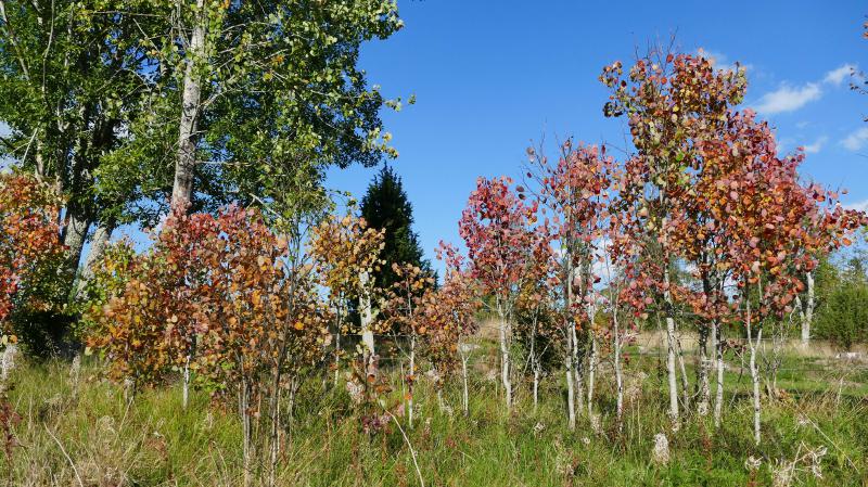 Wir fahren noch etwas weiter und finden einen kleinen Wiesenparkplatz in der Nähe eines Sees. Wir genießen das schöne Wetter und die Espen im herbstrot.