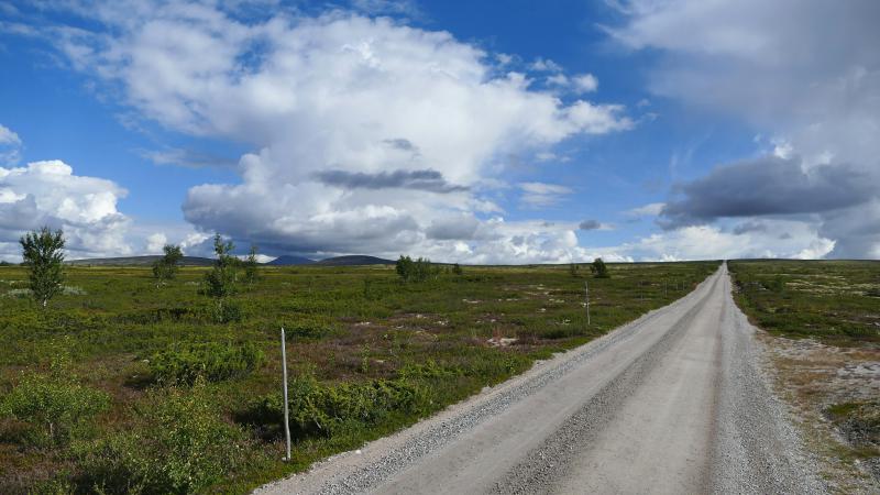 Schotterstraßen führen über das Fjell zwischen Stugudalen und schwedischer Grenze durch eine seenreiche Berglandschaft.