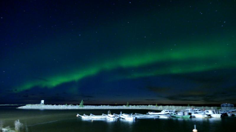 Später folgt die nächste Polarlicht-Show am Himmel, aber unter erschwerten Bedingungen! Das Polarlicht leuchtet diesmal nicht hoch über unseren Köpfen, sondern tiefer über dem Horizont. Unser Platz bietet freien Blick nach Norden, eigentlich perfekt zur Beobachtung und zum Fotografieren von Polarlicht geeignet. Aber, oh Schreck, nach Sonnenuntergang schalten sich Flutlichtstrahler an und beleuchten die Boote im Hafen und unseren Campingbus. Ich gehe zu einem unbeleuchteten Platz am Nordrand des Parkplatzes. WUMM, ein Bewegungsmelder aktiviert den nächsten Strahler. Aber letztlich sind die Bilder gar nicht so schlecht geworden, zumal die angestrahlten Boote und Sträucher aussehen, als wären wir in einer weißen Winterlandschaft :-) Bei 6 Sekunden Belichtungszeit leidet allerdings manchmal die Bildschärfe, wenn das Stativ von Sturmböen hin und her geschaukelt wird. Polarlicht-Fotografie unter erschwerten Bedingungen eben :-)