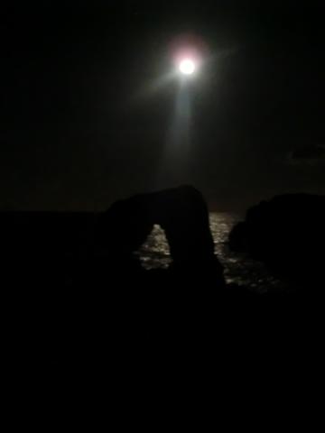 Laut Google Maps ist dies "El Castro de las Gaviotas". Gibt man dies als Suchbegriff bei Google ein, werden unzählige Seiten mit Fotos dazu auf spanischen Websites angezeigt. Das ist offenbar eine echte Touristenattraktion. Da alle Besucher direkt neben unserem Campingbus parken und zu Fuß daran vorbei müssen ist dies also kein geeigneter Stellplatz für den morgigen Sonntag. Als wir in der Finsternis zum abendlichen Hundespaziergang aufbrechen merken wir, dass kurz vorher der Mond hinter dem Felsen aufgegangen ist. Ein bessere Kamera und vor allem bessere fotografische Kenntnisse des Bildermachers hätten hier viel schönere Fotos ermöglicht.