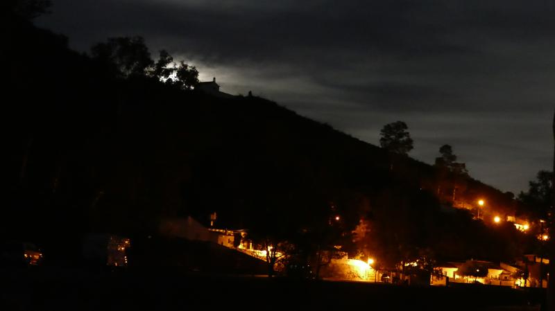 ... verschleiern aber den Mond beim Aufgang hinter der Kapelle über dem beleuchteten Dorf.