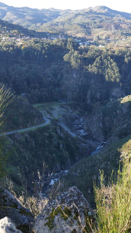 Vom Aussichtspunkt blickt man in die enge Schlucht mit dem wasserarmen Rio Lima.