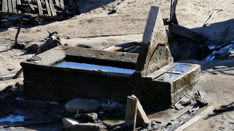 Inmitten einer Trümmerlandschaft steht ein Brunnen. Das Wasser fließt, Quelle und Zuleitung scheinen nach dreißig Jahren noch in Ordnung zu sein.