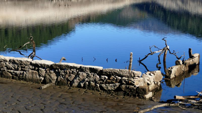 Recht eindrucksvoll zeigt das der Steg zum Bootsanleger, der bei vollem See waagerecht auf dem Wasser schwimmen müsste. Stattdessen liegt er am steilen Hang auf dem Trocknen.