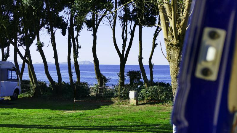 Zum Abschied von dem wunderschön gelegenen Stellplatz Area Sanxenxo gibt es Bilder aus der Schiebetür mit Blick auf den selbst ausgebauten Bus und das Wohnhaus des Betreibers sowie auf das Meer.