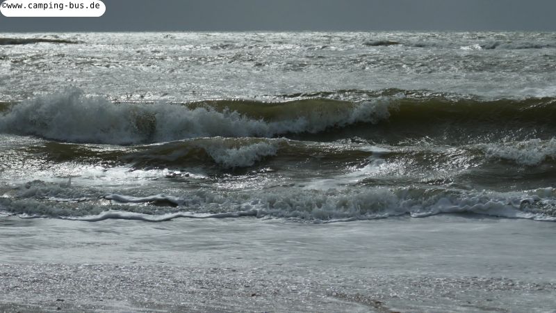 Der Wind bläst aus West-Südwest und trifft nicht frontal auf die Küstenlinie - man sieht, die Wellen kommen von der Seite. Ansonsten würden Wasser und Wellen sicher erheblich höher steigen.