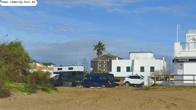 25. bis 28.01. La Palma del Condado - Islantilla 84 kmSeit Beginn unserer Reise haben wir ja unglaublich Glück mit dem Wetter gehabt. Aus allen Regionen der iberischen Halbinsel erreichen uns seit Ende Dezember Meldungen über Regen und Sturm während wir ganz überwiegend von der Sonne verwöhnt werden. Das wird sich nun aber nach den Wetterprognosen auch bei uns für die nächsten Tage ändern. Wir versuchen, windgeschützte Plätze mit festem Untergrund zu finden und fahren Sonntag wieder auf den Strandparkplatz Islantilla, auf dem wir bereits vor einer Woche waren. Dramatische Wolken über dem glänzenden Meer empfangen uns hier.