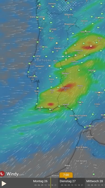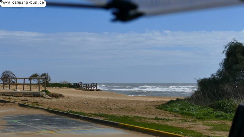 Als der Wind nachlässt gehe ich nochmal an den Strand, danach beschließen wir spontan, jetzt die Costa de la Luz zu verlassen. Für die nächsten Tage werden nur noch Böen bis 60 km/h angekündigt. Die vorerst höchsten Wellen haben wir also gesehen. Das Hauptziel unserer Reise ist ja Galicien! Also machen wir uns auf den Weg nach Norden. Mal sehen, wann wir dort ankommen.