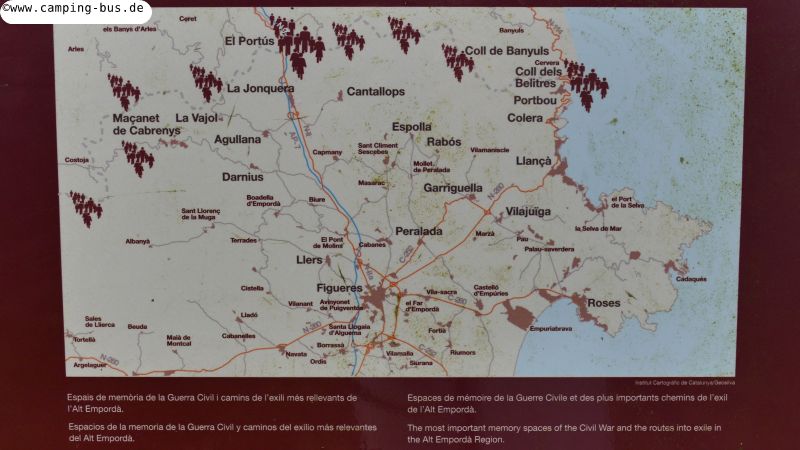 Für ihn und alle anderen Flüchtlinge wurden nach dem Ende der Franco-Diktatur ab 1975 an der Grenze mehrere Denkmäler aufgestellt. Dies am Coll de Manrella entstand 1981 und wurde von der spanischen Seite durch eine Straße erschlossen. Weitere Denkmäler und Erinnerungstafeln gibt es unter anderem in La Vajol, einem Versteck vieler Franco-Gegner. Von hier brachen sie auf in die erhoffte Freiheit nach Frankreich, so wie der katalanische Politiker Lluís Companys i Jover. Nun kommt leider die deutsche Geschichte ins Spiel: Nach der Besetzung Frankreichs wurde er durch die Gestapo verhaftet, an Spanien ausgeliefert und durch die Franco-Diktatur zum Tode verurteilt und erschossen.