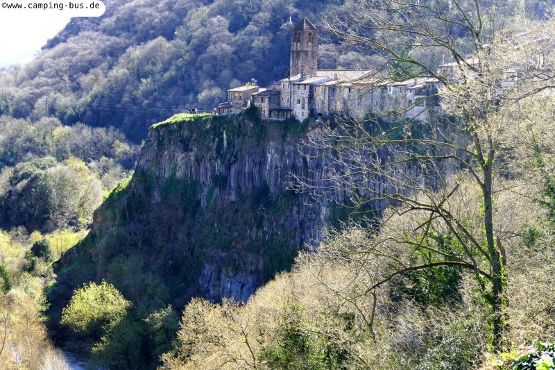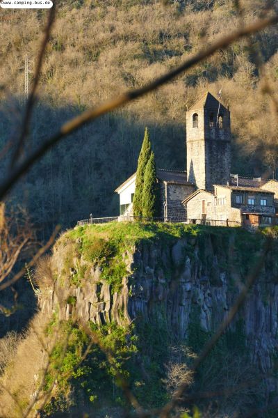Dann bleiben wir lieber noch zwei Tage auf der Südseite, holen unseren Besuch in Castellfollit nach und fahren von dort über den Coll d`Ares nach Frankreich. Castellfollit de la Roca ist ein mittelalterliches Dorf auf einer 50 Meter hohen Basaltklippe zwischen den Flüssen Fluvià und Toronell. Vom Aussichtspunkt vor der Kirche schaut man auf drei Seiten in den Abgrund.