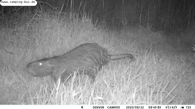 In der wasserreichen Region fühlen sich neben vielen Vögeln auch Nutrias und Bisamratten wohl. Gleich nach unserer Ankunft am Rhône-Sète-Kanal finden wir schmale und etwas breitere "Wege" am Schilf zwischen den Gewässern. Am breiten Pfad erscheint in der Nacht zunächst ganz vorsichtig ein Nutria und inspiziert das ungewohnte Gerät neben seinem Weg.
