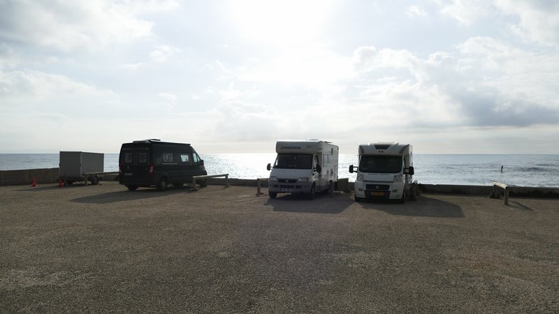 Das wird sich bald ändern, der Wind nimmt zu, für Mittwoch und Donnerstag sind Böen von 90 bis 100 km/h angekündigt. Ob wir auf dem Stellplatz auf der Felsnase zwischen Hafen und Meer bleiben? Ja klar, wegen genau dieser Wetterprognose sind wir ja jetzt hier!