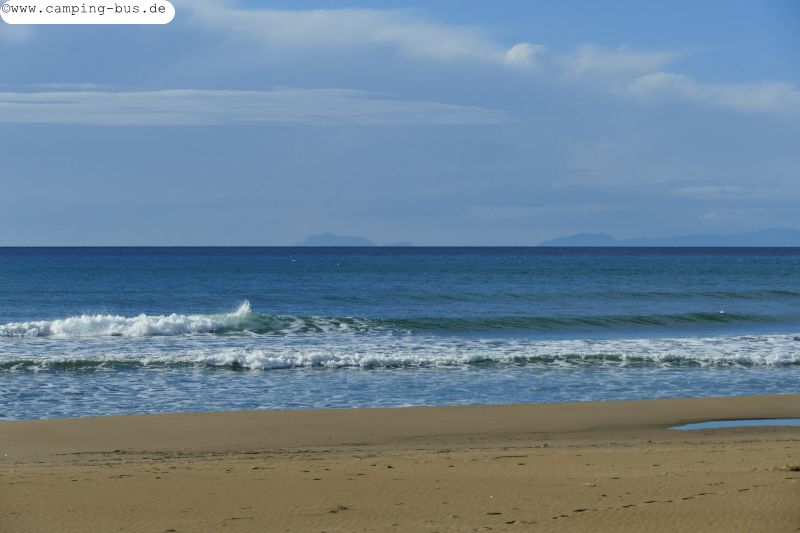 Blauer Himmel, Strand und Wellen beim Blick aus dem Wohnzimmer - auf diesem Platz bleiben wir am Sonntag, an dem hier nur wenige Menschen unterwegs sind.