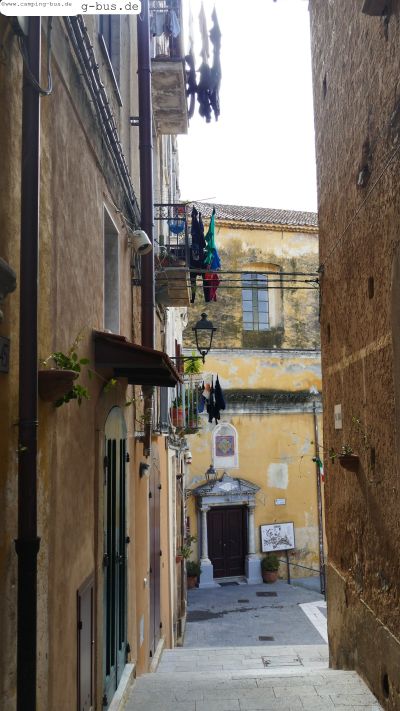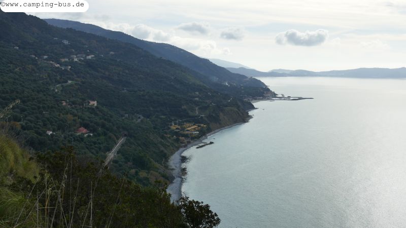 27. bis 29.01. Marina di Pisciotta - Marina di Camerota 25 kmAm nächsten Morgen verlassen wir den Ort über die südliche Ausfahrt. Und da - nur da! - steht ein Schild mit dem Hinweis auf ein Parkverbot für Campingfahrzeuge im gesamten Ort Marina di Pisciotta. Die nördliche Zufahrt ist ziemlich neu. Da hat offenbar niemand dran gedacht, solch ein Schild aufzustellen. Von Palinuro nach Marina di Camerota führt die Küstenstraße mal nicht hoch über dem Meer an den Hügeln sondern direkt am Strand entlang.