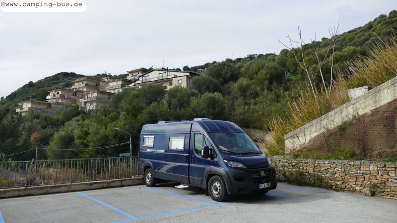 Der einzige ebene Platz im Ort ist der Parkplatz, auf dem wir stehen. Also kann man nur hier Fußball spielen. Genau das wollen einige Jungs mit Beginn der Abenddämmerung, wer wollte es ihnen übel nehmen. Unser Blauer Nordfriese soll aber nicht als Torpfosten dienen. So fahren wir wieder runter nach Marina di Pisciotta, wie schon am Morgen über die nördliche Zufahrt. Einzige Beschränkung ist laut Beschilderung ein Fahrverbot für LKW über 10t auf der schmalen Straße. Wir verbringen hier eine ruhige Nacht.