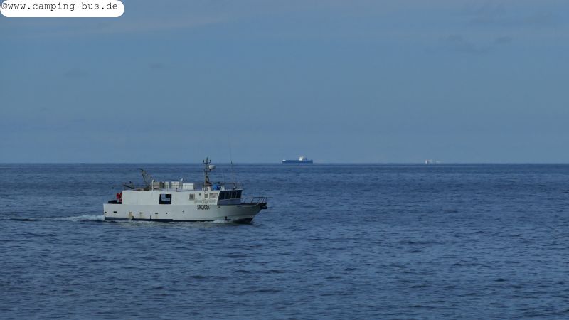 Hinter uns tuckern die Fischerboote hin und und her, in der Ferne sehen wir die Containerfrachter vor dem Hafen von Gioia Tauro ...