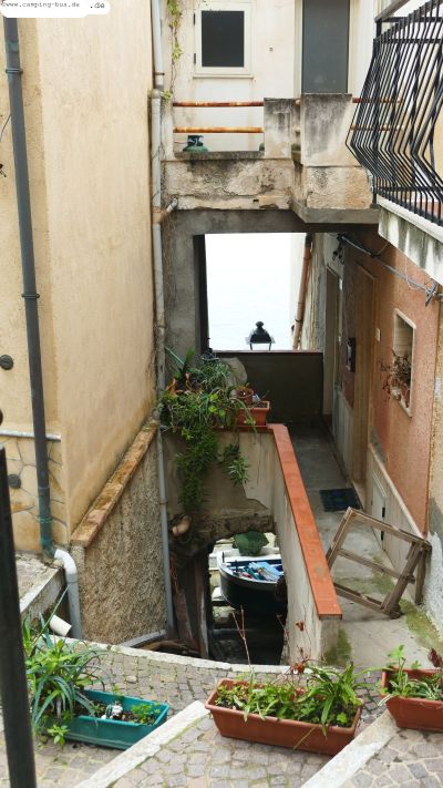 Wir parken am östlichen Ortsrand direkt an der SS18. Von hier sind es ca. tausend Meter bis zum Hafen ohne große Höhenunterschiede. Der Zugang führt durch einen Tunnel. Wir wundern uns über parkende Autos im Tunnel und merken, dass sie zu den Häusern gehören, die hier am Steilhang unterhalb des Tunnels stehen.