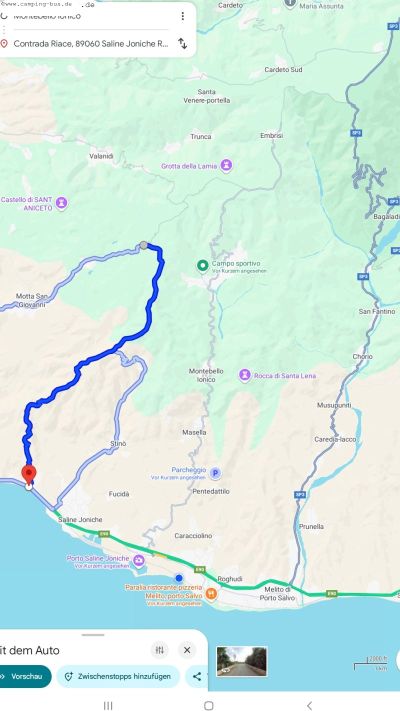21./22.02. Gallico - Aspromonte ( Ristorante Schiccio, Camping Primi Faggi) 36 kmFreitag wollen wir eigentlich zunächst zu einem Aussichtspunkt in die Berge nach Calanna. Allerdings ist nach der Streetview-Recherche zweifelhaft, ob wir im Ort mit unserem Blauen Nordfriesen um die scharfe Kurve und durch die schmale Zufahrtsstraße passen. Als wir dann von unten den Ort steil über uns und die Serpentinen auf der Karte sehen, brechen wir den Versuch ab.