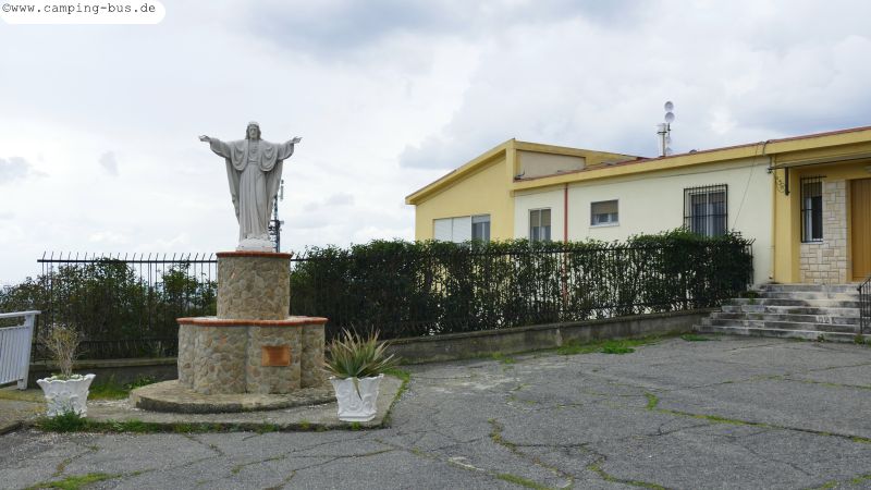 Über Nacht hat es für kurze Zeit geregnet und am Morgen wollen die Wolken sich noch nicht verziehen. Dazu weht ein kräftiger Wind mit stürmischen Böen. Der Platz auf dem Hügel über Cirò Marina am Santuario Madonna d´Itrio ist deshalb trotz der schönen Aussicht nicht für einen längeren Aufenthalt geeignet, zumal anscheinend das Pfarrhaus direkt an die Kirche gebaut wurde.