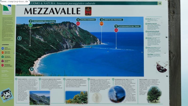 26. bis 28.03. Marina di Chieuti - Ancona/ Parco del Conero / Portonovo 273 kmStatt der geplanten zwei Tage bleiben wir allerdings nur einen denn über Nacht erreicht uns am Mittwochmorgen von Süden der angekündigte Regen. Etwa eine halbe Stunde nach der Abfahrt in Marina di Chieuti verlassen wir das Regengebiet und erreichen Mittwochmittag unser nächstes Ziel südlich von Ancona mit trockenen Reifen. So klar wie auf der Info-Tafel des Parco del Conero sehen wir die Steilküste leider nicht.