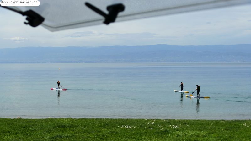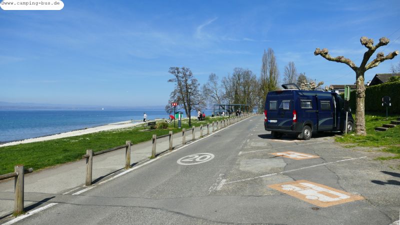 Kein Grund zur Freude sind die sechs Plätze aus P4N am Südufer des Genfer Sees, die wir als mögliche Ziele zum Bleiben anfahren. Einige sind völlig ungeeignet zum Übernachten, im bekannten Ort Evian-les-Baines veranlasst uns die Park- und Gebührenordnung zum sofortigen Weiterfahren. Auch die Lage der vier schmalen Wohnmobil-Parzellen direkt an der Hauptstraße am Südufer des Sees ist denkbar ungeeignet.