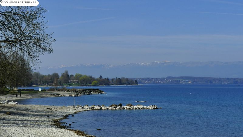 Auch wenn die Nachbarplätze belegt sind haben wir aus dem großen Seitenfenster auf der Fahrerseite und aus den Heckfenstern unverbaubare freie Sicht auf den See sowie Orte und Berge auf der Schweizer Seite im Norden.